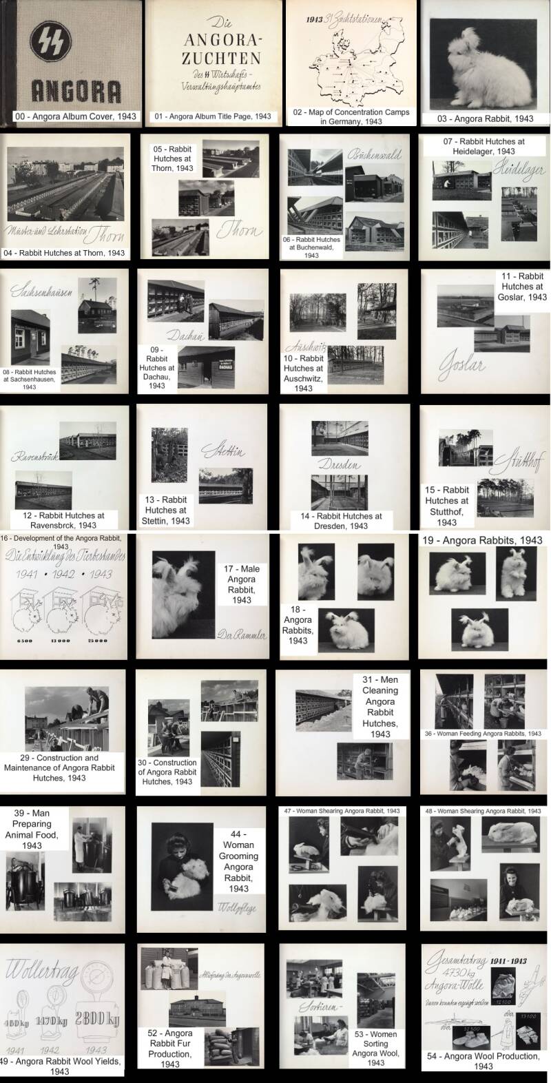 The album above shows angora farms in German facilities, including concentration camps such as Dachau, Buchenwald and Auschwitz. The Angora rabbit project was an SS project for breeding Angora rabbits. The objective was to provide fur for the linings of jackets for Luftwaffe pilots.
