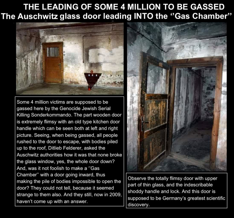 Some deniers have pointed out these are air raid shelter doors even advertised as such. Well, obviously there was no company in Germany manufacturing Jew-killing gas chamber doors now, was there? I have no idea what deniers want to achieve with an argument like this. You kill people with pesticide, not a "people killer". Similarly, you lock people in with air raid shelter doors, not "people trapping" doors.