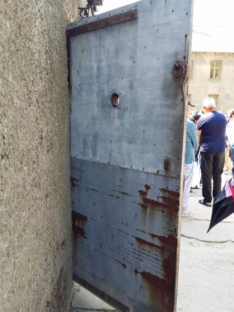 This is the door (with peep hole) on the entrance of Krema I. You can see on the sign outside (http://i.imgur.com/duS3xZA.jpg) that this door does not lead directly to the gas chamber (labeled c on the sign), but to an antechamber. Of course I cannot rule out that this isn't the gas chamber door taken from the inside and remounted on the exterior as the SS converted Krema I to an air-raid shelter in 1944. In any case, it doesn't look flimsy to me even 70 years after it was installed. Maybe to a group of 200 pound weightlifters, but not to me.