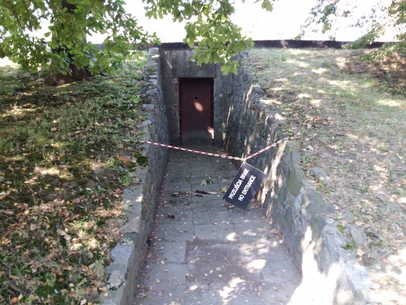 An equally sturdy looking door, mounted on the building's exterior as Krema I was converted into an air-raid shelter. This exit, as well as the additional vestibule ("air-lock") constructed inside the gas chamber, did not exist until 1944.