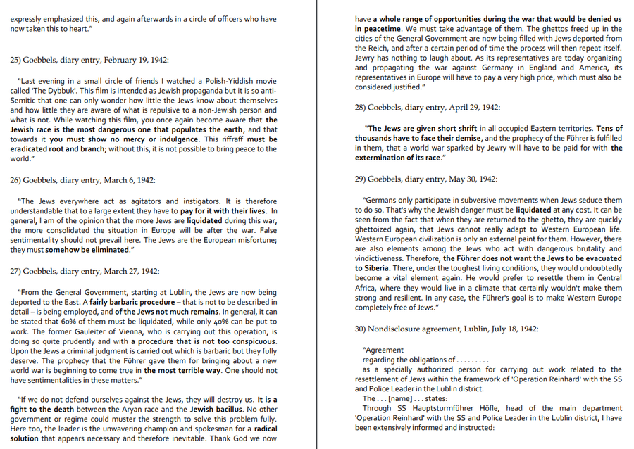 Holocaust deniers often like to claim there is no physical evidence written on paper that the Nazi regime was planning on physically exterminating European Jews. But they couldn't be further from the truth. From the plethora of documents left that prove this, one such example are the many diary entries and other publications of Joseph Goebbels which make the genocidal intent of the Nazi regime all too clear. =====
