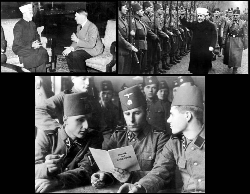 Friendly reminder to all White Supremacist National Socialist Aryan racists, that their beloved Führer was an admirer of the Mohammedan faith. Pic related shows his meeting with the Grand Mufti of Jerusalem, Mohammed Amin al-Husseini, at the top left in December 1941. He is seen on the right, greeting Bosnian Waffen-SS volunteers in November 1943 (to his left is SS General Karl-Gustav Sauberzweig), and the bottom shows Bosniak soldiers of the SS 13 Division, reading Husseini's pamphlet "Islam and Judaism", wearing one of those funny stereotypical hats you call Fez.