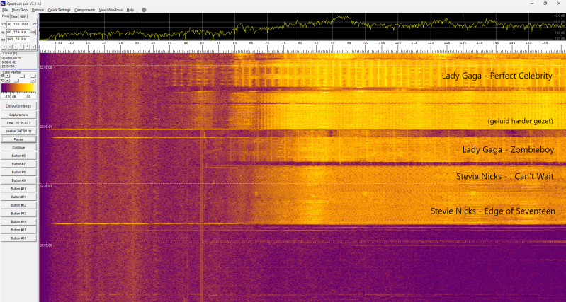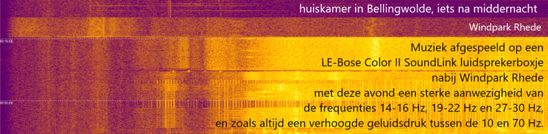 Om nieuwe software te testen (een decibel datalogger genaamd REW) had ik muziek opgezet terwijl Spectrumlab het geluidsspectrum vastlegde. Op deze pagina zie je het resultaat daarvan. Het luidsprekertje (een LE-Bose Color II) was niet in staat het subsonische niveau van 20 Hz te beïnvloeden, maar had wel interactie met de frequenties vanaf ongeveer 40 Hz en vooral vanaf 60 Hz. De "geest van Windpark Rhede", tussen de 10 en 75 Hz, blijft ondanks de verschillende muziekstijlen herkenbaar. Als je op deze pagina snel naar boven en naar beneden scrolt, zie je de frequentiebanden bij alle muzikanten en muziekstijlen terugkomen. Bijvoorbeeld bij de 110 Hz.