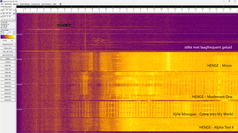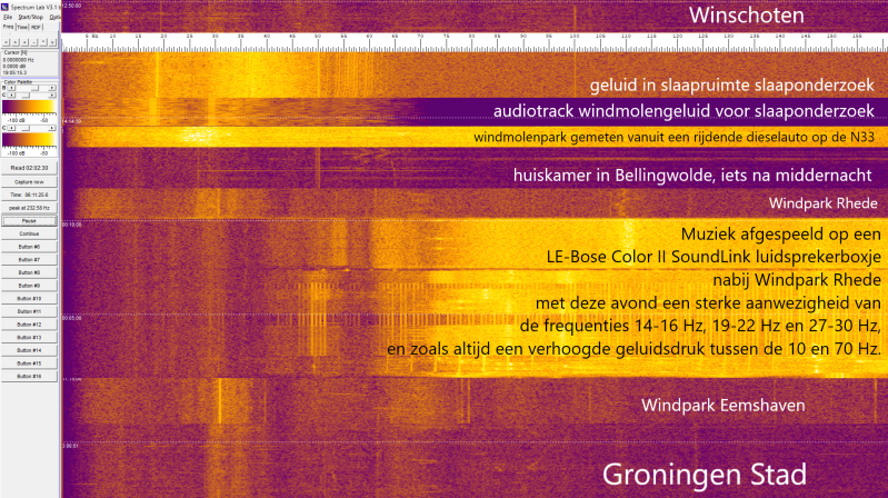 Om nieuwe software te testen (een decibel datalogger genaamd REW) had ik muziek opgezet terwijl Spectrumlab het geluidsspectrum vastlegde. Op deze pagina zie je het resultaat daarvan. Het luidsprekertje was niet in staat het subsonische niveau van 20 Hz te beïnvloeden, maar had wel interactie met de frequenties vanaf ongeveer 40 Hz. De "geest van Windpark Rhede", tussen de 10 en 75 Hz, blijft ondanks de verschillende muziekstijlen herkenbaar.