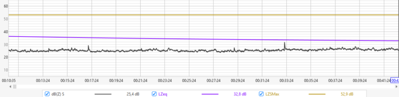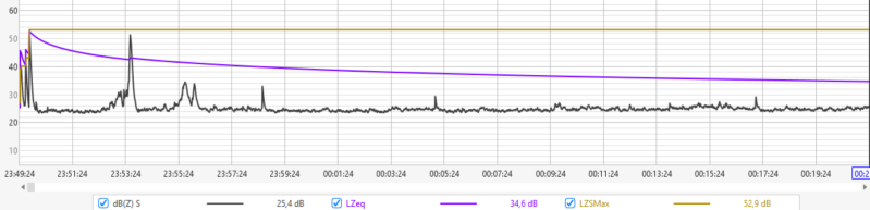 En geel staat voor de Lmax, hier LZSmax, waarbij S staat voor Slow Response en "max" voor het maximale geluid tijdens de meting, hier niet zo relevant omdat de waarde duidelijk is bepaald door het moment dat ik het programma aanzette en de deur van de kamer sloot (de hoge piek aan het begin van de grafiek). Bij toekomstige metingen ga ik de Lmax weglaten.