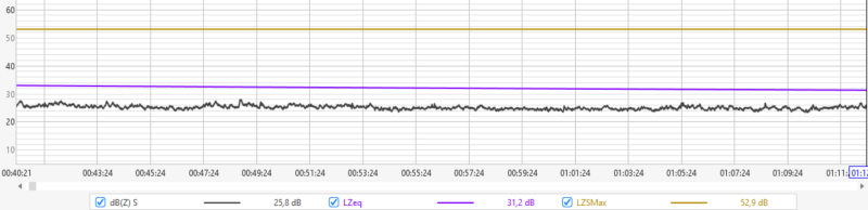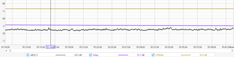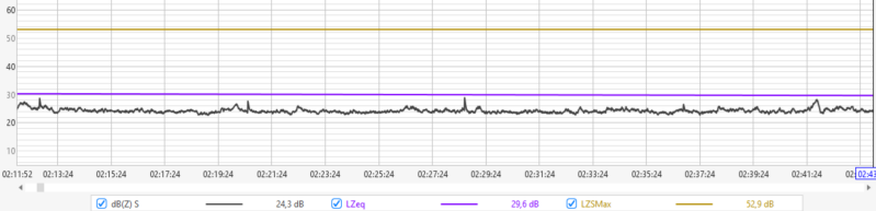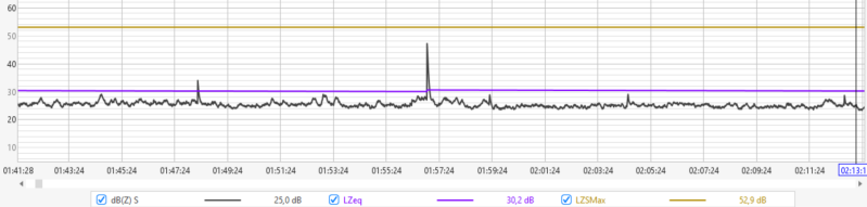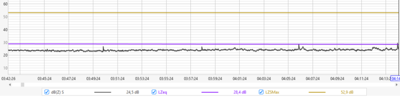 Ik heb toen ik wakker was geen geluid gemaakt, en de microfoons staan in een andere ruimte opgesteld. Om 03:57, nog in bed gelegen, heb ik met mijn NIOSH SLM app een decibelmeting gedaan. Dit kwam uit op 52 dB(Z). Met de NIOSH SLM app meet ik eigenlijk consistent hogere waardes dan met de PreSonus Revelator (podcast)microfoon. In toekomstige metingen ga ik een microfoon gebruiken die geschikter is voor geluidsmetingen.