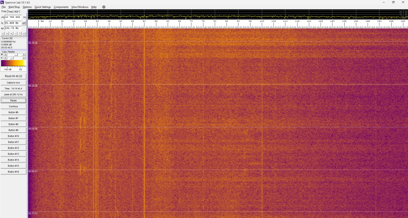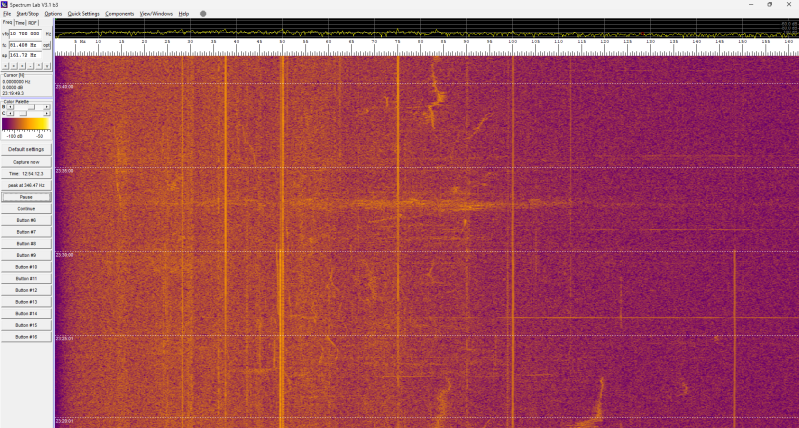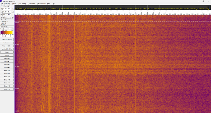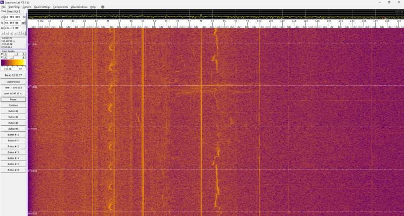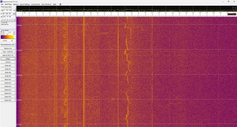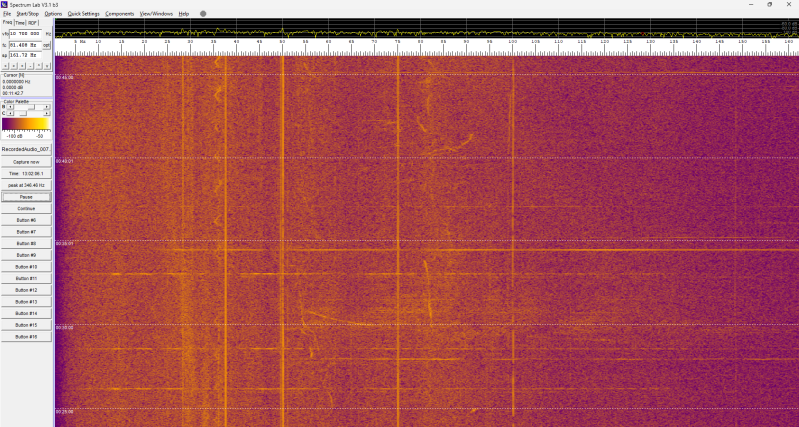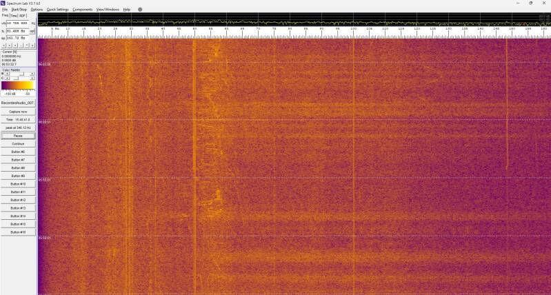 Vanaf hier (tussen ongeveer 01:00 en 02:00 uur) is de windrichting al omgekeerd of zal deze spoedig omkeren. Merk op dat er (ook in het voorgaande uur al) in toenemende mate onrustige patronen te zien zijn in de Spectrumlab waterval. Hieronder vooral tussen de 35 en 37 Hz, en ook tussen de 80 en 90 Hz.