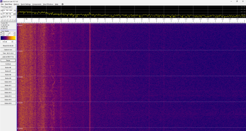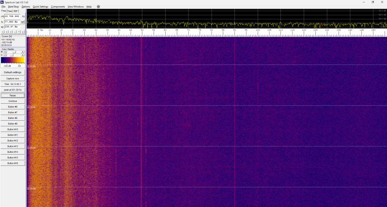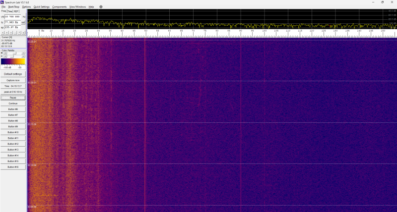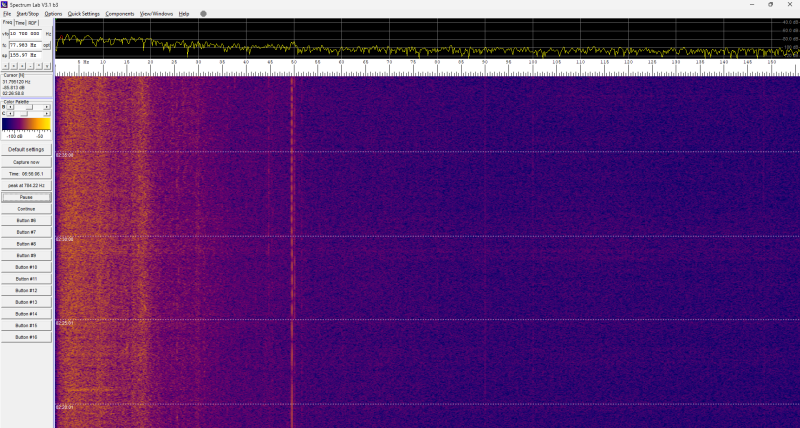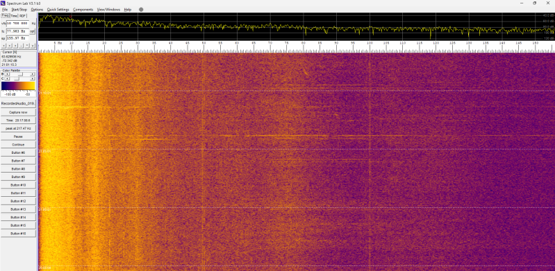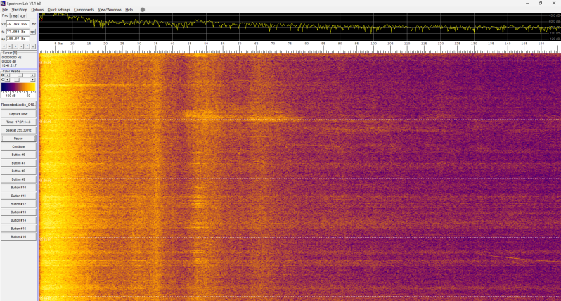 Hieronder het geluidsspectrum tijdens mijn diepe slaap (volgens Sleep Cycle vanaf 14:10). Merk op dat er om 14:20 een signaal verschijnt bij de circa 27 Hz, naast het al opvallende signaal van 25 Hz. In de REW grafiek hierboven zien we rond dit tijdstip een opvallende stijging in de geluidsdruk. Ook rond 15:27 en 15:45 erg opvallende pieken.