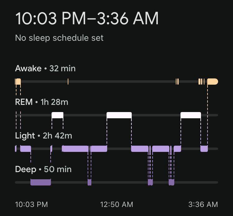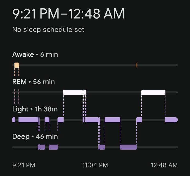 Fitbit is weer het meest optimistisch. In dit geval door, in tegenstelling tot Sleep Cycle en Oura, ook een korte N3 te zien tussen elf uur en middernacht.