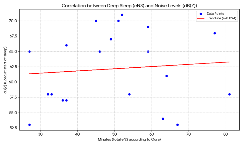 Interpretation: A Pearson correlation of 0.09 indicates a very weak positive relationship (essentially no linear correlation) between the amount of deep sleep (eN3) and the noise levels (dB(Z)) at the start of your main sleep. The high -value () suggests that this slight correlation is not statistically significant and could likely be due to random chance rather than a direct relationship between these two specific variables in this dataset.