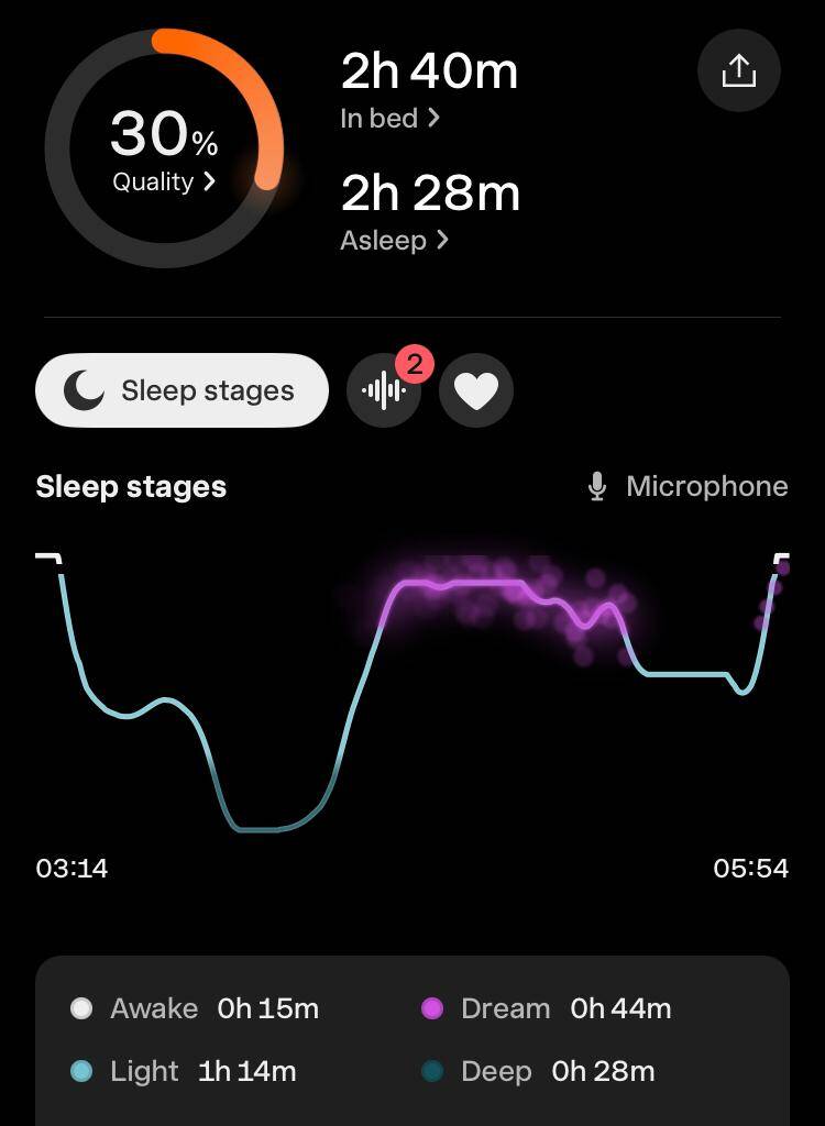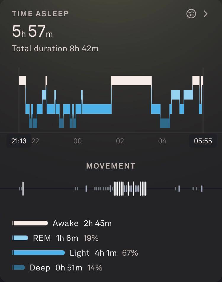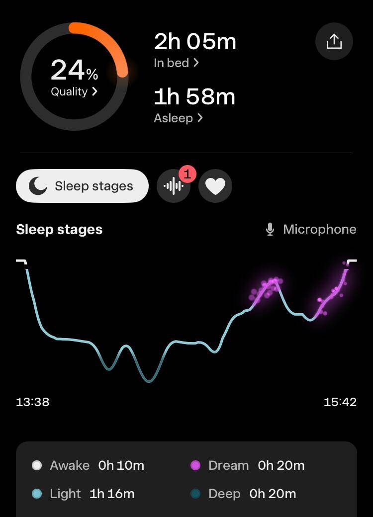 Vrijwel direct na dit ontwaken heb ik geprobeerd om opnieuw in slaap te vallen, en ik ben 42 minuten stil in bed blijven liggen, maar zonder de slaap te hervatten. Sleep Cycle heeft het geïnterpreteerd als lichte slaap, maar ik weet zo goed als zeker dat ik bij bewustzijn ben gebleven. Ik beschouw dit daarom niet als een dutje. Een echt dutje gaat waarschijnlijk later op de dag plaatsvinden.