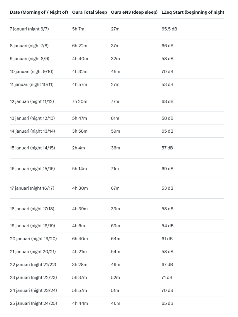 De dataset is natuurlijk nog beperkt: 20 nachten, met een app (Oura) die de eerste dagen nog moest calibreren. Bovendien zaten er een aantal dagen van hevige verkoudheid ertussen, en veel dagen waarop dutjes van anderhalf uur hebben plaatsgevonden. Ook relevant is dat ik voor deze statistische analyse de geluidsdruk aan het begin van de slaap heb opgegeven, terwijl de geluidsdruk tijdens een nacht enorm kan stijgen of dalen.