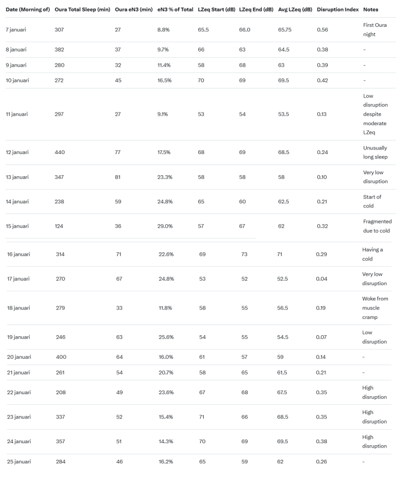 - Highest disruption (0.35–0.42): Nights like 10 Jan (69.5 dB, only 45 min eN3), 22–24 Jan (67.5–69.5 dB, 49–52 min) — high LZeq strongly suppresses deep sleep.