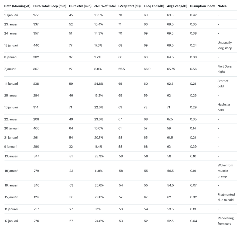 - Lowest disruption (0.04–0.13): Nights like 17 Jan (52.5 dB avg, 67 min eN3) and 19 Jan (54.5 dB, 63 min) — deep sleep thrives when LZeq is moderate/low.