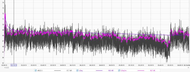 Rond 02:00 uur een opvallende piek (61 dBZ) in de geluidsdruk, en opnieuw een rond 02:30 (60 dBZ):