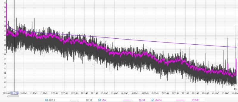 In grote lijnen dus een geluidsdruk rond de 64 dBZ, constante schommelingen tussen de 62 en 67 dBZ, en enkele pieken van wel 68 dBZ: