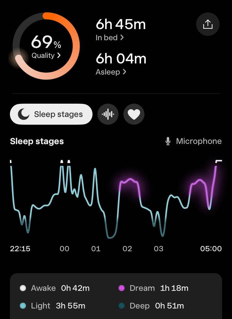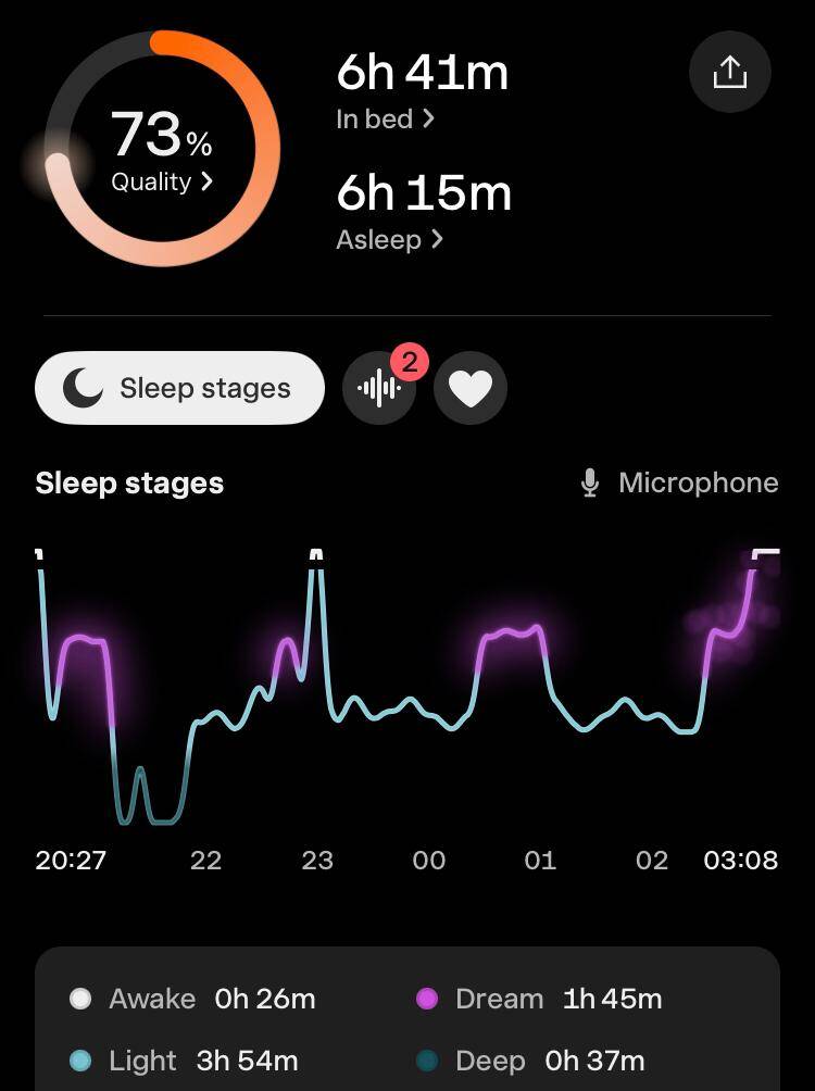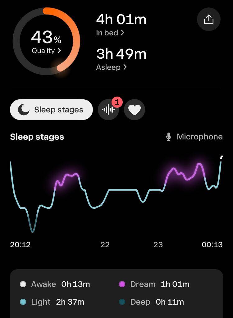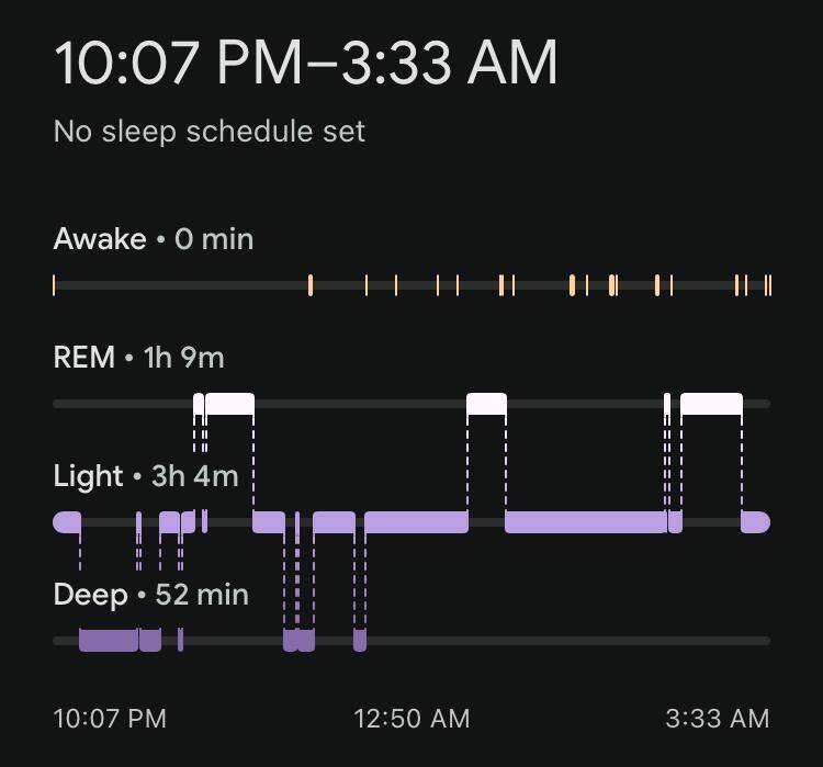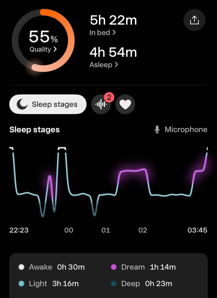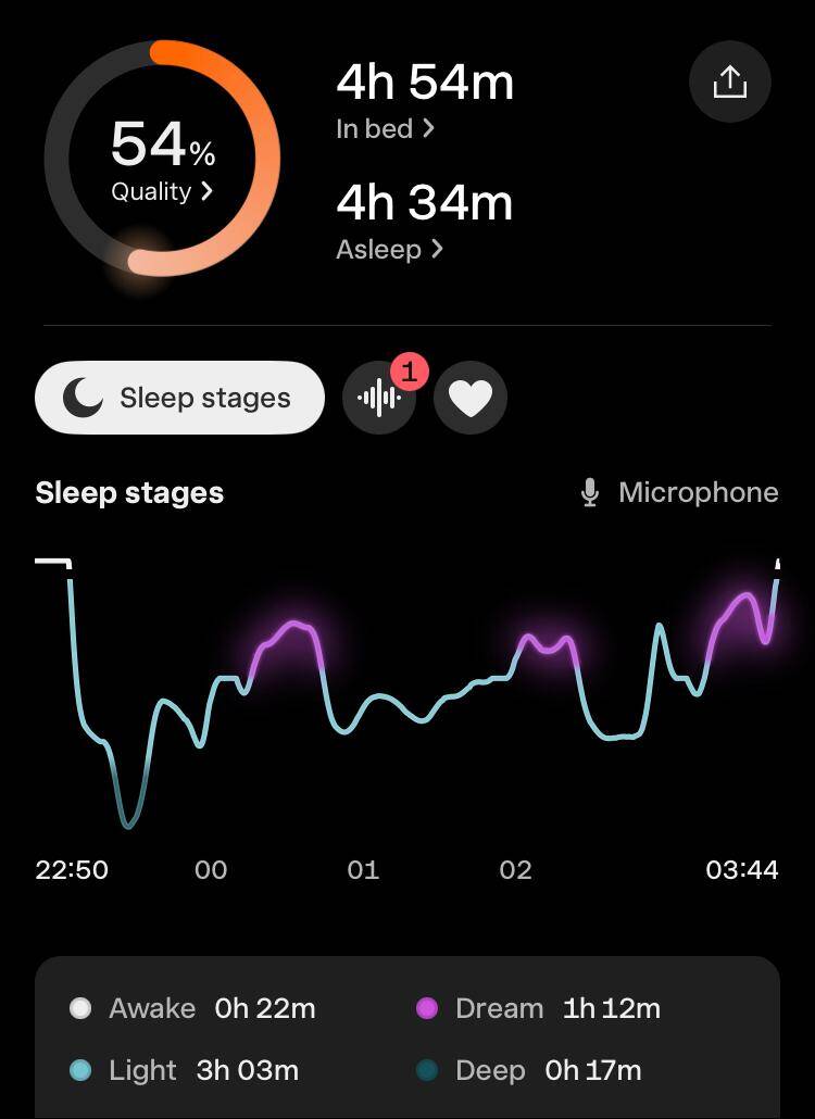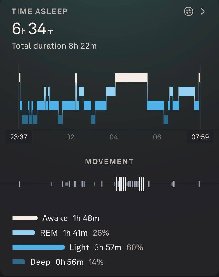 Toch was de slaapkwaliteit wel een tegenvaller. De hoeveelheid eN3 (estimated N3, de geschatte hoeveelheid diepe slaap) was volgens de apps: