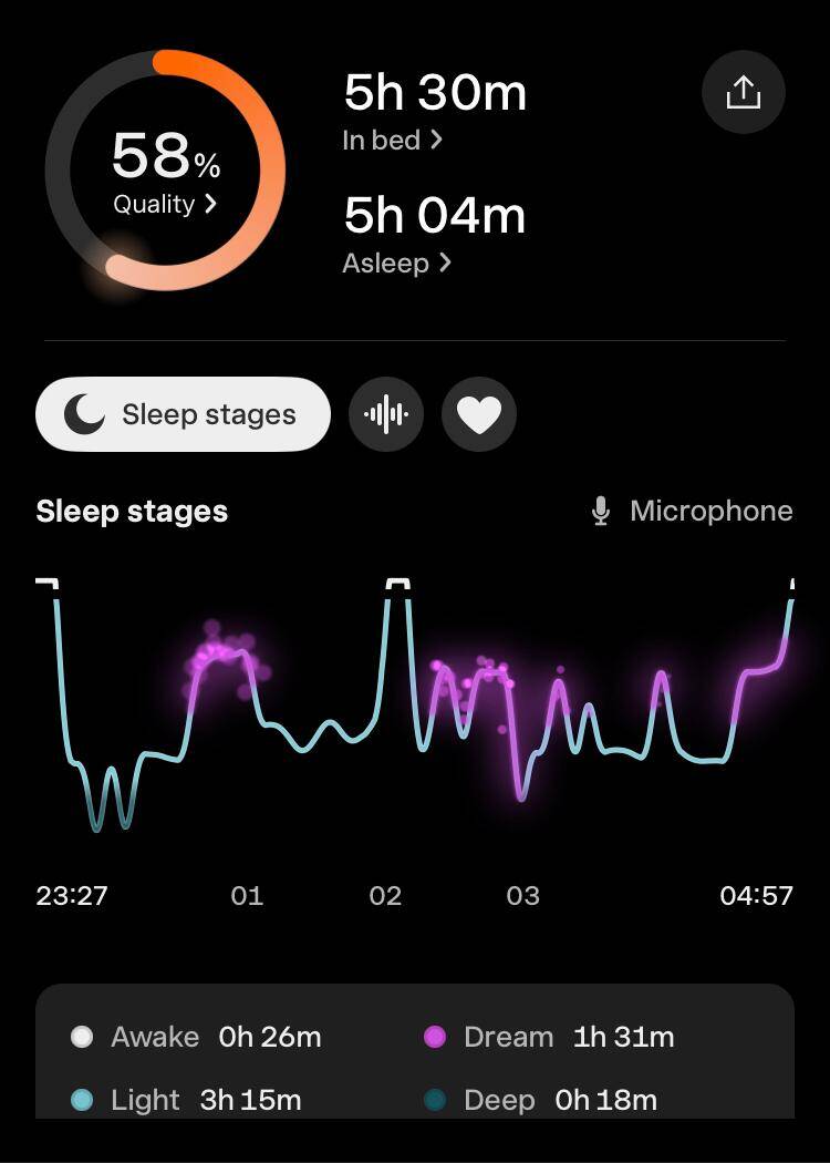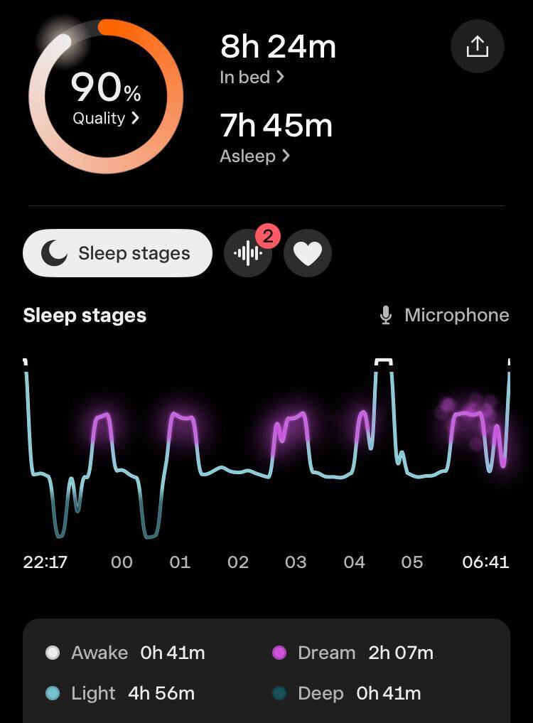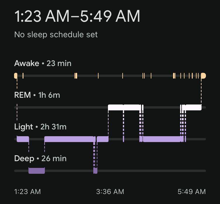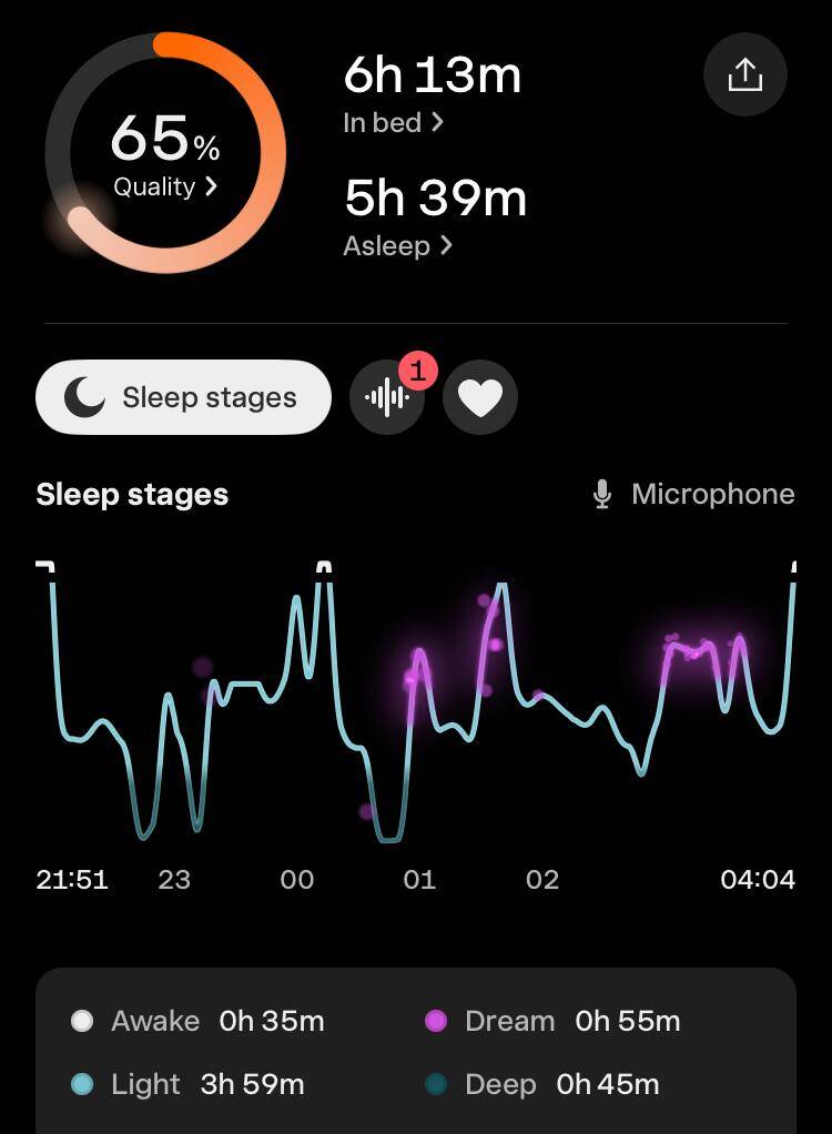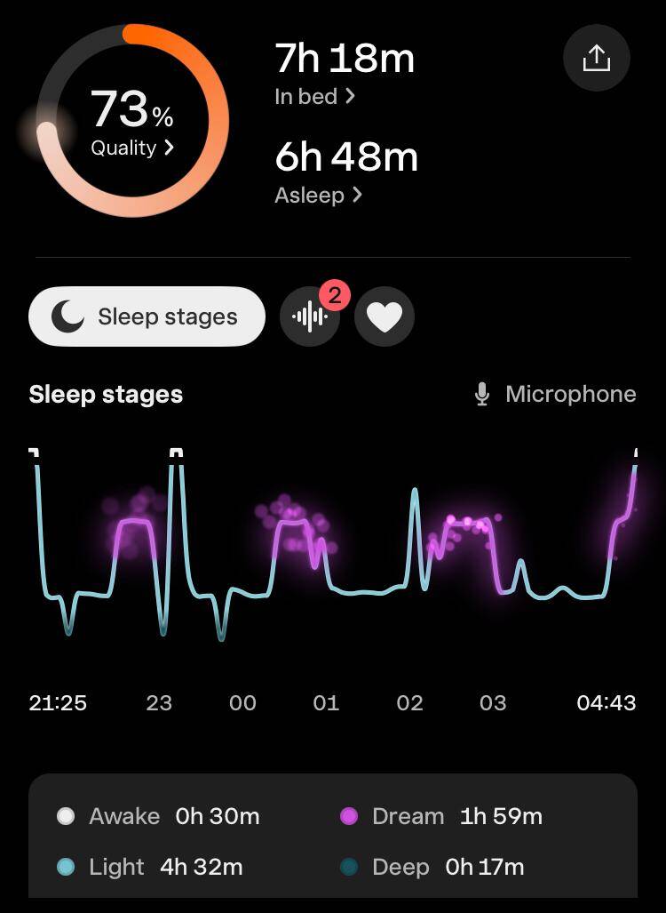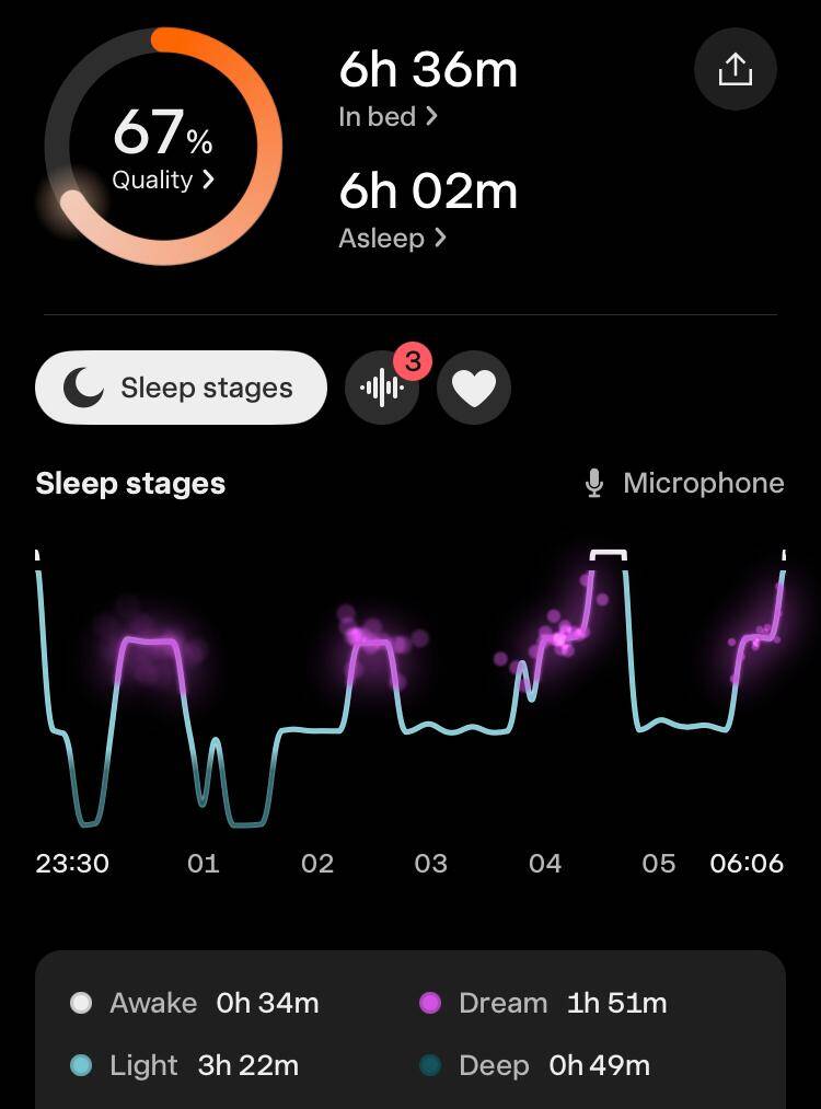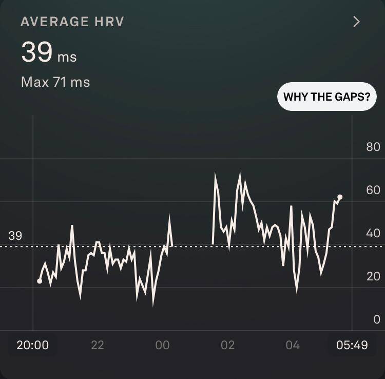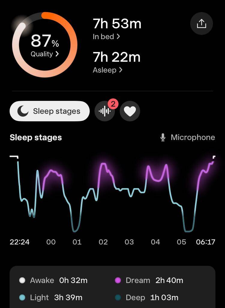 Toch was de slaapkwaliteit wel een tegenvaller. De hoeveelheid eN3 (estimated N3, de geschatte hoeveelheid diepe slaap) was volgens de apps: