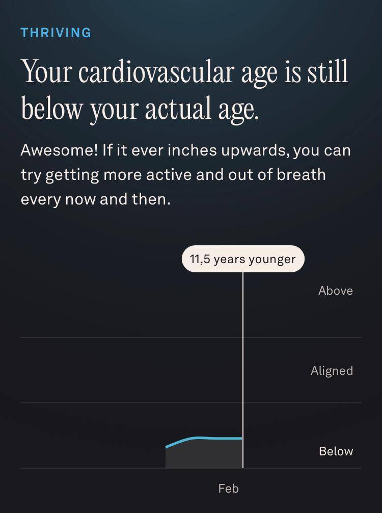 En met mijn hart gaat het uitstekend: cardiovasculaire leeftijd is 11,5 jaar lager dan mijn feitelijke leeftijd.