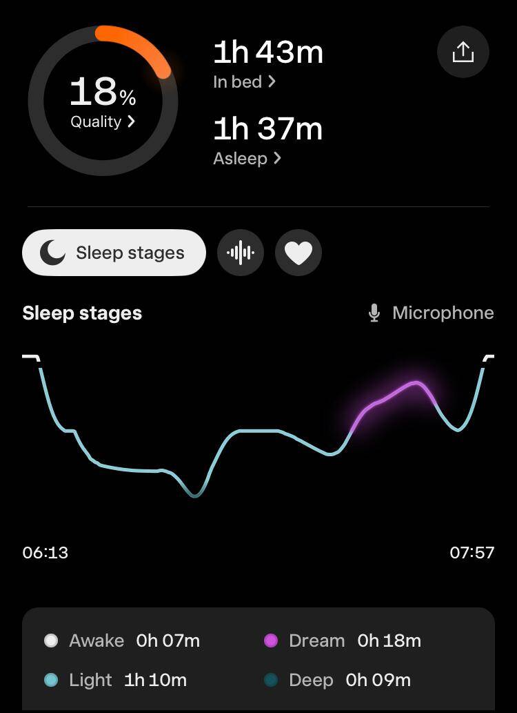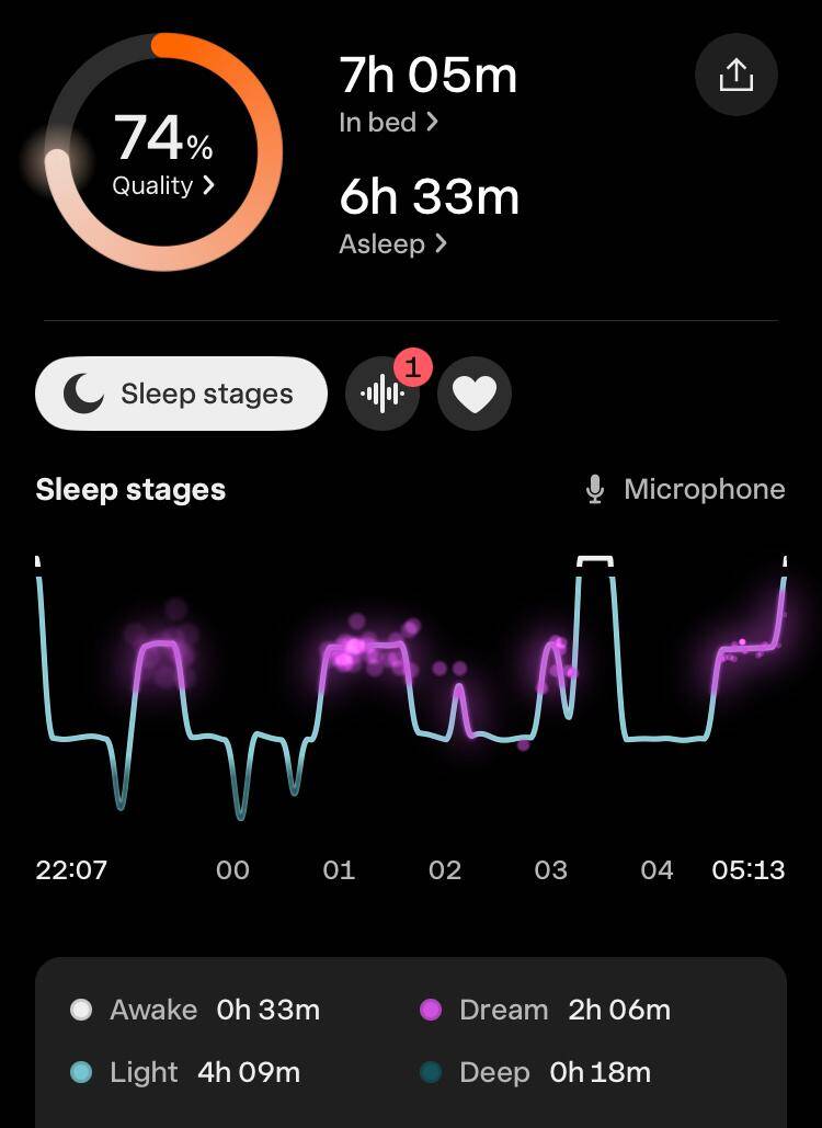 Ik zie achteraf dat ik al even "in slaap" was gevallen voordat ik Sleep Cycle aanzette. Aan de decibelweging is te zien dat ik een uur na het aanzetten van de meting (en het beluisteren van ontspanningsmuziek van Dr. Jeffrey Thompson) weer ben opgestaan om naar het toilet te gaan. Oura en Fitbit hebben deze meditatieve toestand als slaap geïnterpreteerd. Het is mogelijk dat ik ook daadwerkelijk geslapen heb, maar ik kan me niet herinneren dat ik ben wakker geschrokken. Voor zover ik me kan herinneren heb ik op een gegeven moment mijn koptelefoon afgedaan, ben ik naar het toilet gegaan, heb ik Sleep Cycle aangezet, en ben ik gaan slapen.