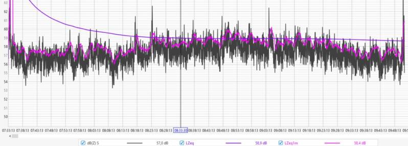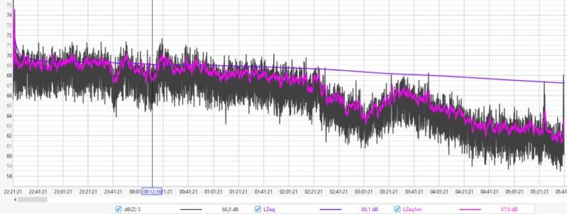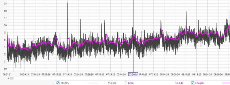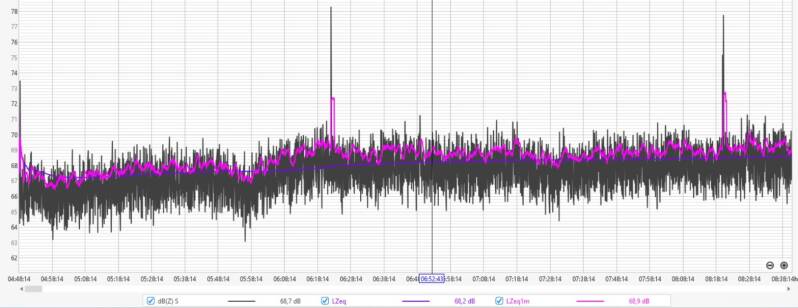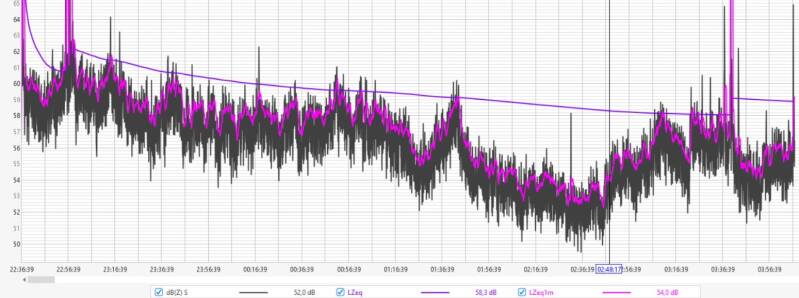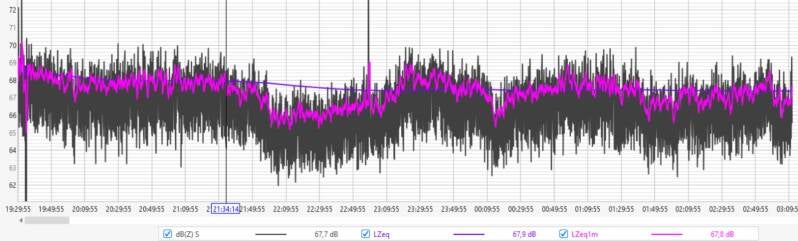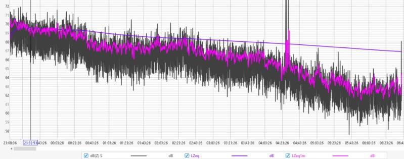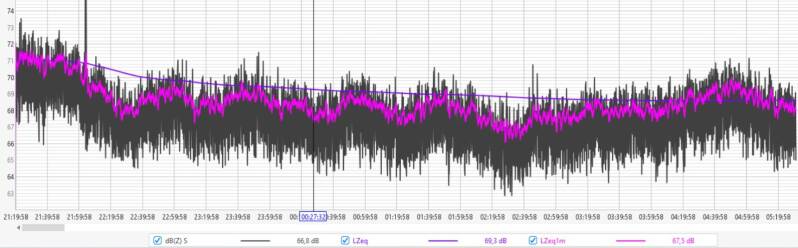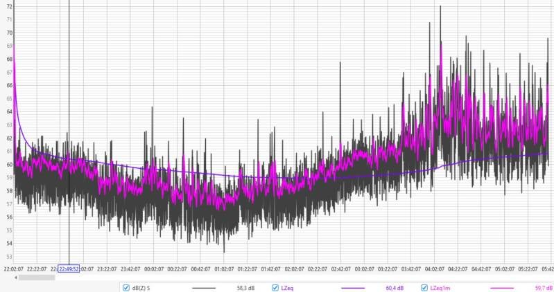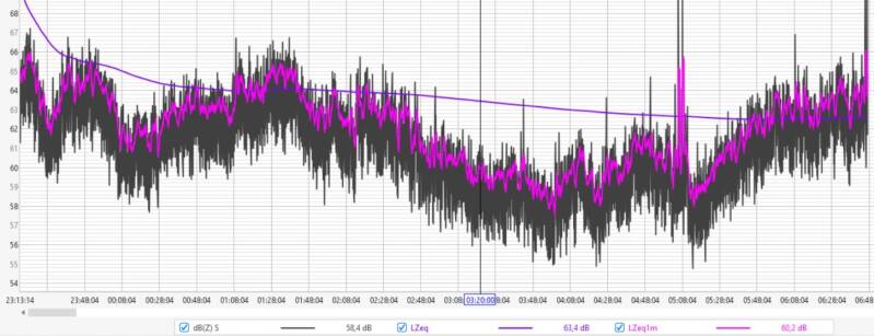 Afgelopen nacht fluctueerde de geluidsdruk tussen de 60 en 64 dBZ, met een LZeq1m rond de 64 dB aan het begin van de nacht en 60 dB rond het ontwaken.