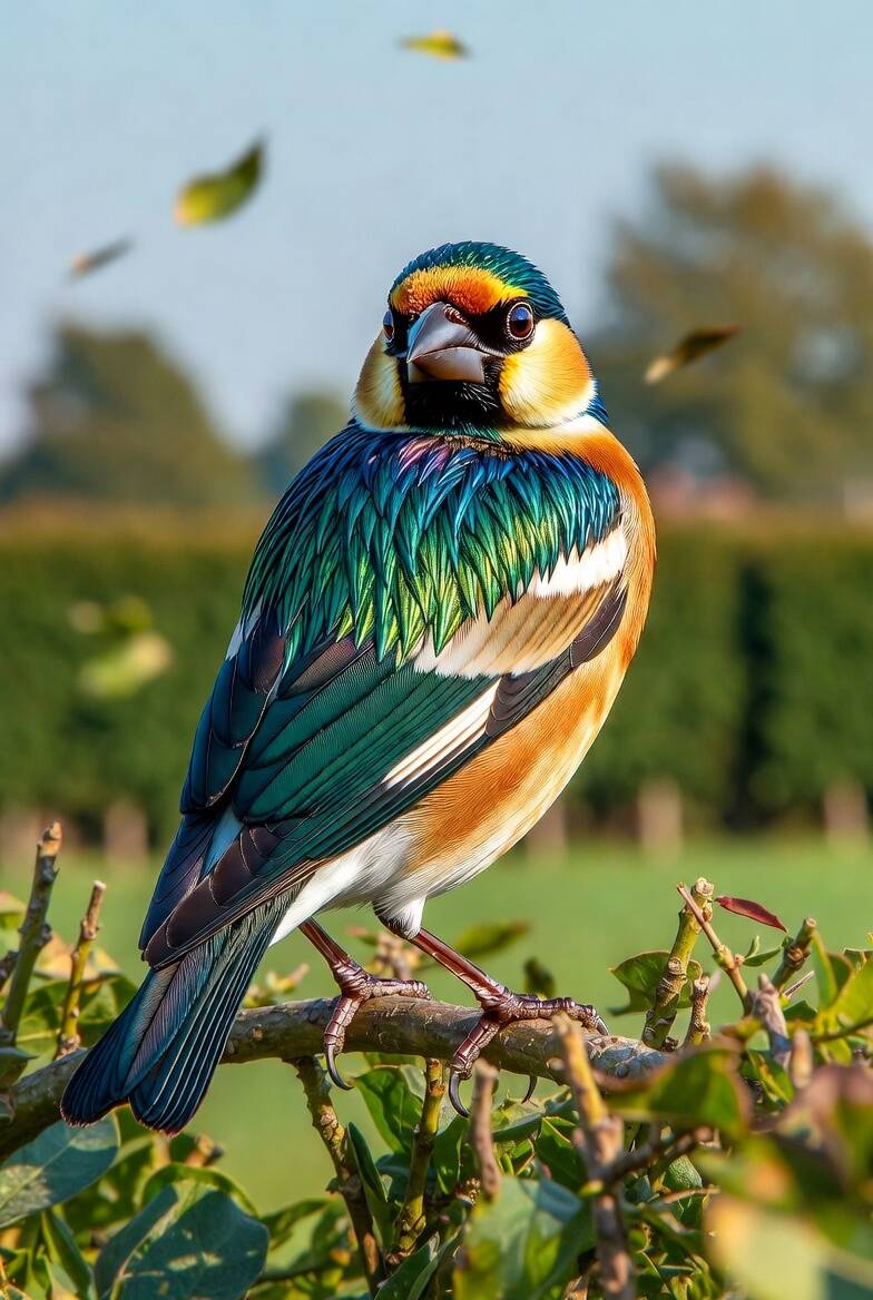 De Lofzanger is een beweeglijke, fonkelende verschijning. Zijn lichaam draagt het fijne silhouet van de putter, maar zijn veren tonen de iriserende schakeringen van de spreeuw: olieachtig groen, blauw en violet die veranderen met elke draai van het licht. Zijn masker is scherper omlijnd dan bij andere putterhybriden, en zijn ogen blijven voortdurend alert, alsof hij de wereld niet alleen ziet maar ook beluistert.