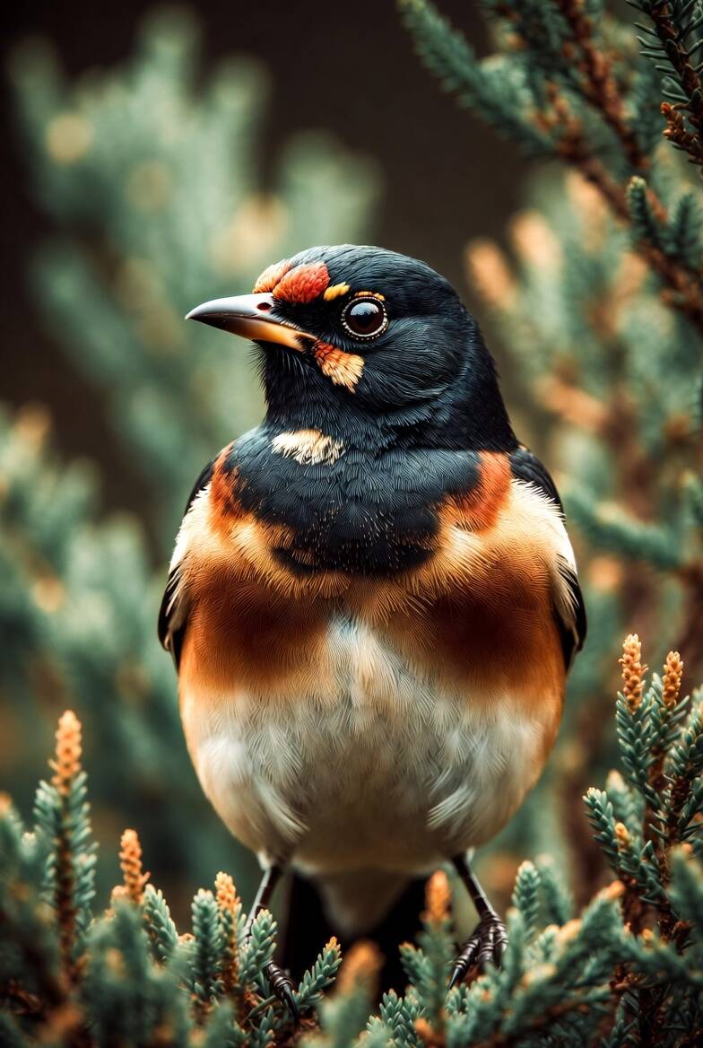 De Hartklank heeft een zachter voorkomen dan zijn verwanten. Zijn verenkleed combineert het warme bruin en diepe zwart van de merel met subtiele goud- en roodaccenten rond het gezicht en de vleugels. Zijn ogen zijn groot en donker, met een vochtige glans die zijn gevoeligheid verraadt.