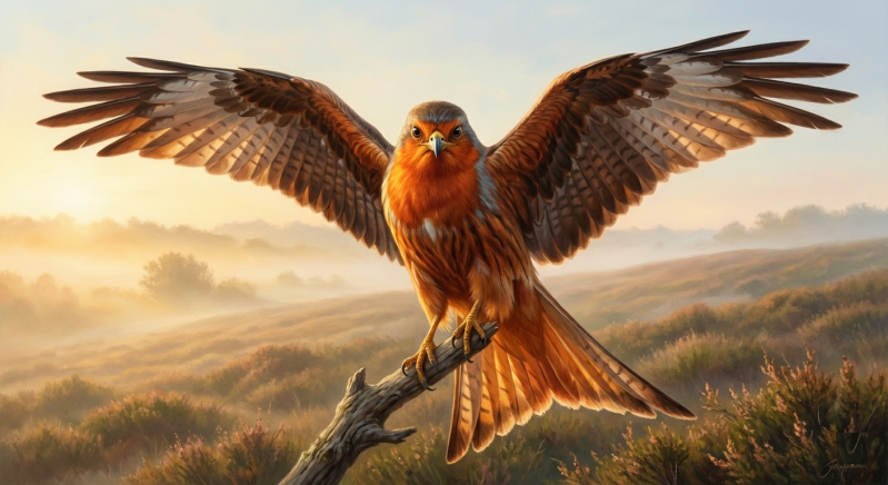 De Vlamtop Wouwroodborst verenigt twee ogenschijnlijk verschillende gestalten: de brede, zwevende vleugels en gevorkte staart van de rode wouw, en de compacte, frontale felheid van het roodborstje. In vlucht toont hij zich ruim en cirkelend, hoog boven het landschap; eenmaal geland staat hij rechtop, borst vooruit, als een klein brandpunt van aanwezigheid.