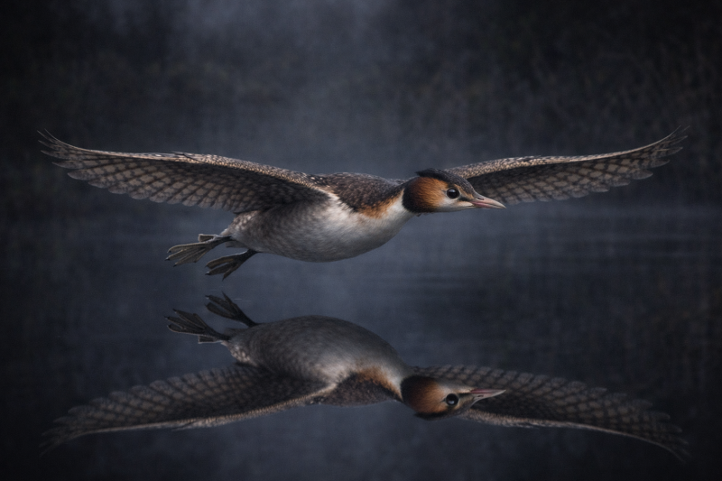 Het vrouwtje reageert met bedachtzame precisie. Zij observeert zijn tekens, voegt subtiele accenten toe, verschuift een veer of bevestigt een element van het riet, en zo ontstaat een stille, energetische dialoog. Hun balts ontvouwt zich als een ritueel van wederzijds vertrouwen en innerlijke harmonie, waarin aandacht, afstemming en subtiele energie-uitwisseling centraal staan.