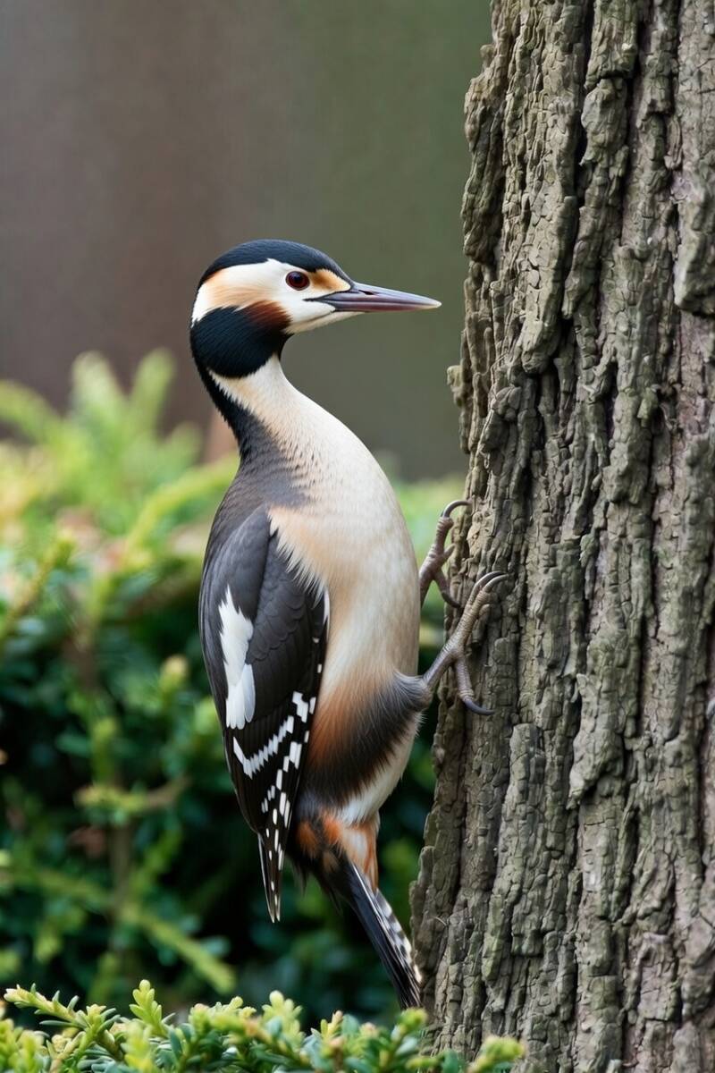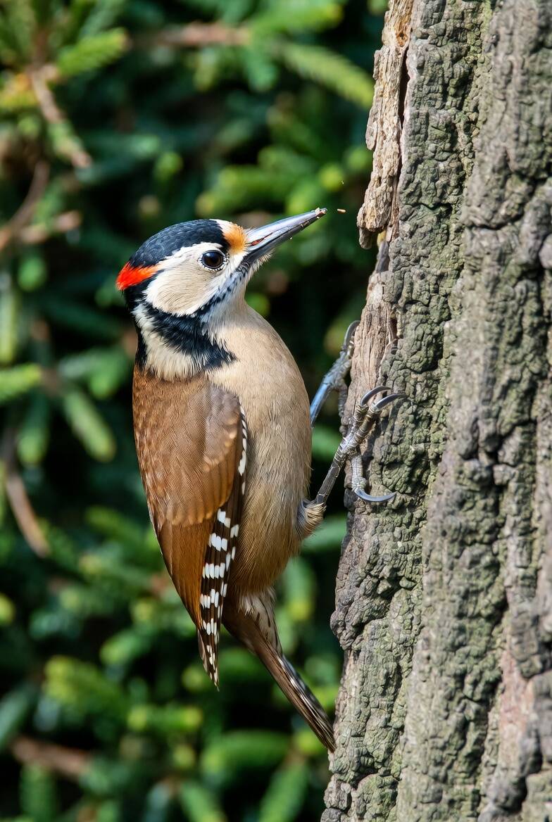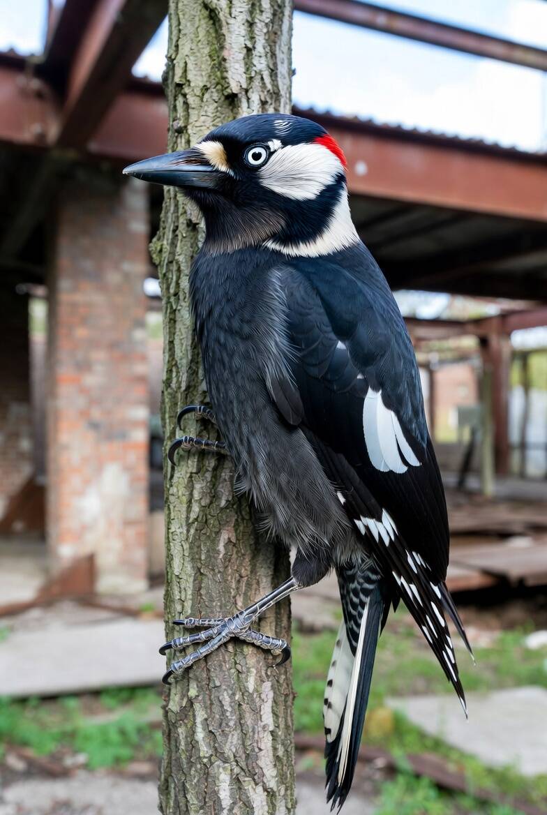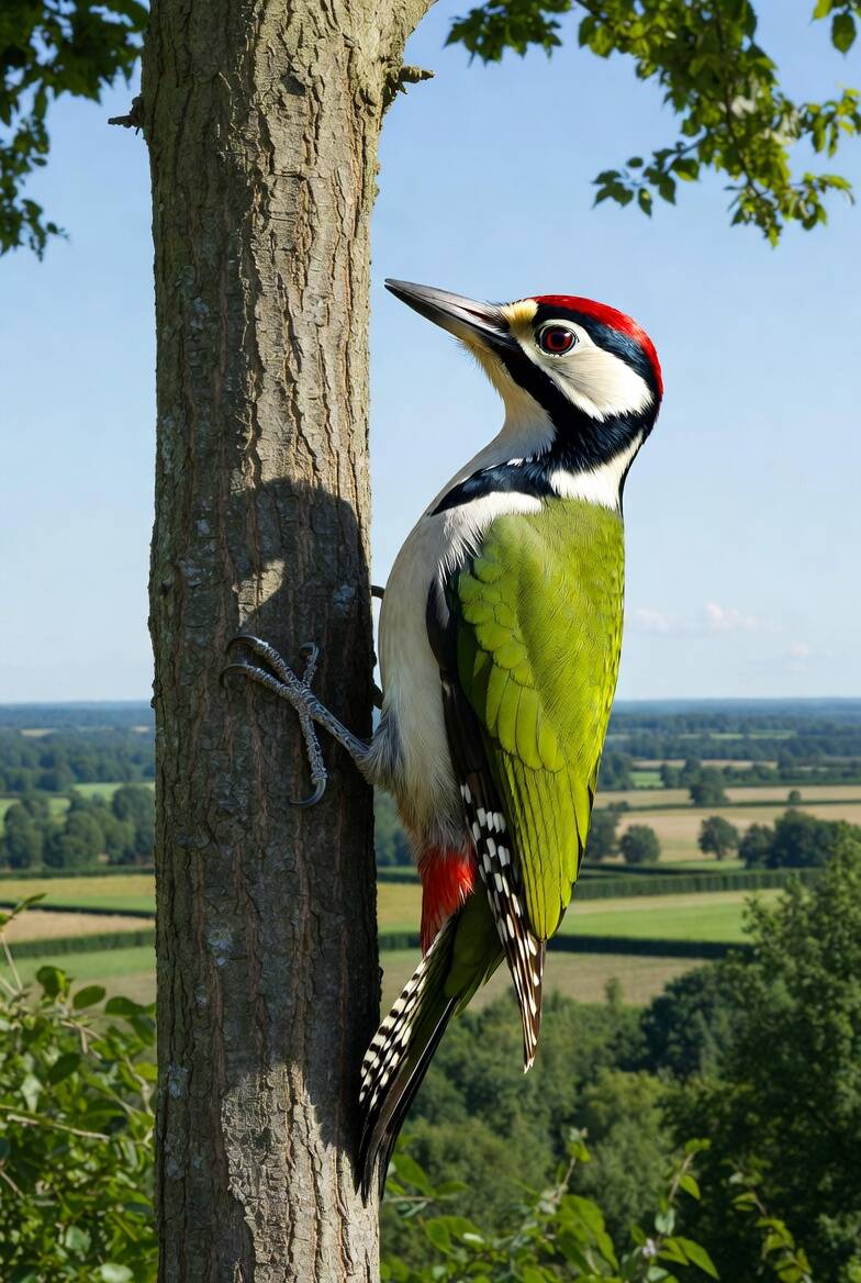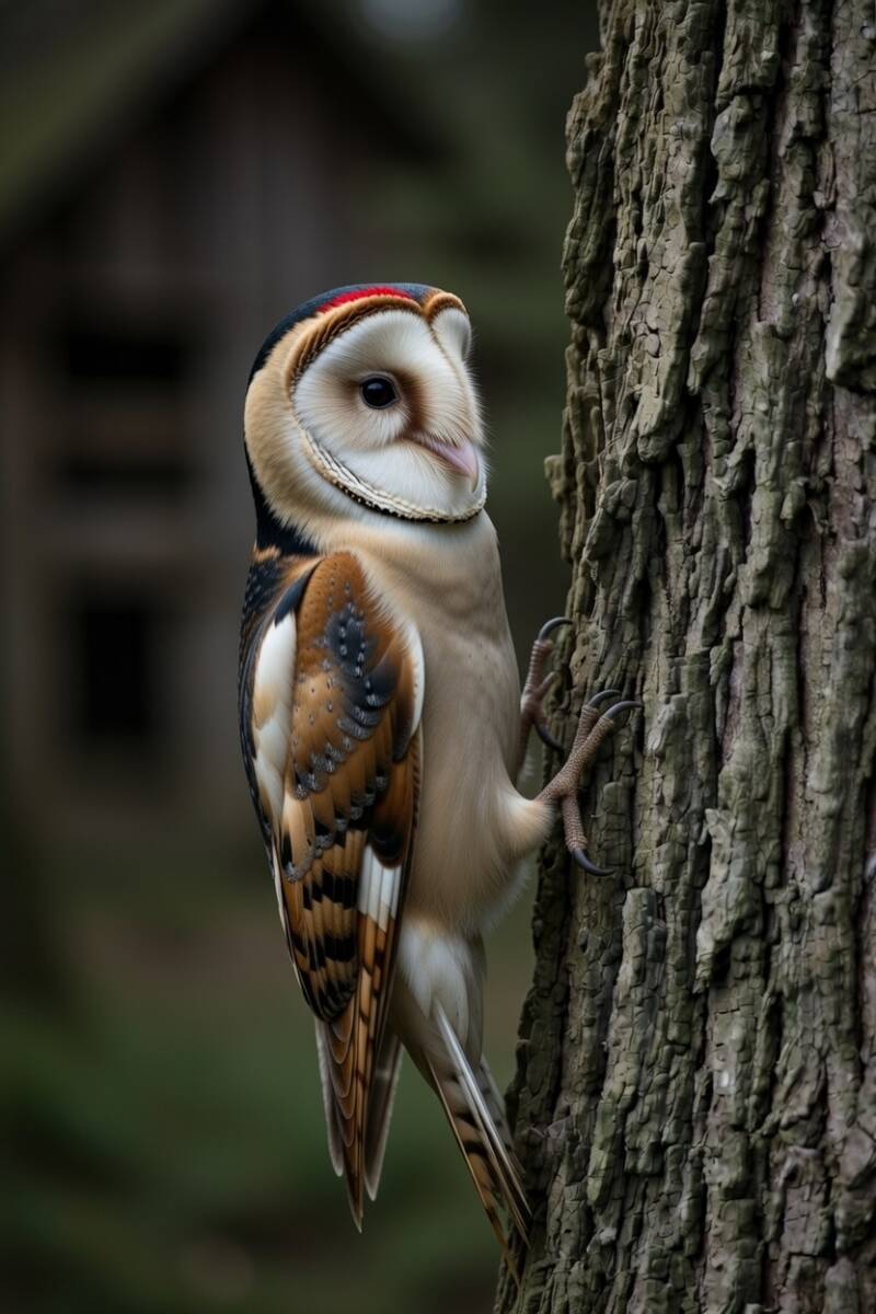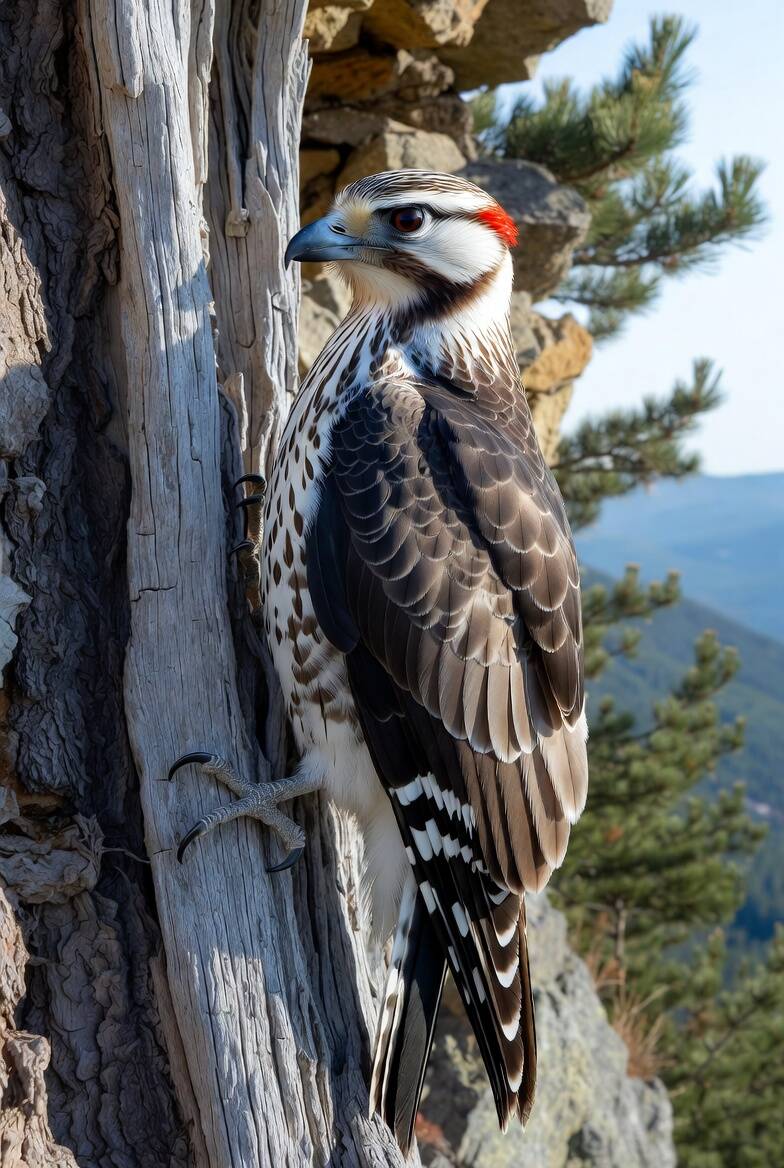 De Smidslag Wouwspecht combineert de brede, zwevende vleugels en gevorkte staart van de rode wouw met het contrastrijke zwart-wit en karmijnrode kruin van de grote bonte specht. Zijn verenkleed oogt dynamisch: roestbruin en roomwit doorsneden met krachtige zwarte lijnen.