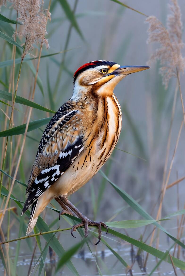 De Getijden Roerdompspecht draagt het gecamoufleerde, rietkleurige verenkleed van de roerdomp, vermengd met het contrastrijke zwart-wit en rode kruinaccent van de grote bonte specht. Zijn lichaam lijkt op te gaan in de omgeving; zijn bewegingen zijn traag, bijna meditatief — tot het moment van actie.