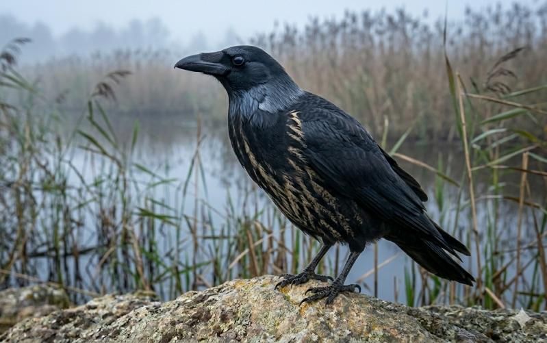 De Medium Roerdompraaf combineert het gedrongen, sierlijke lichaam van de roerdomp met het glanzend zwarte, absorberende verenkleed van de raaf. Zijn nekveren zijn zacht gebogen, met zilverachtige schakeringen die glinsteren in het schemerlicht.