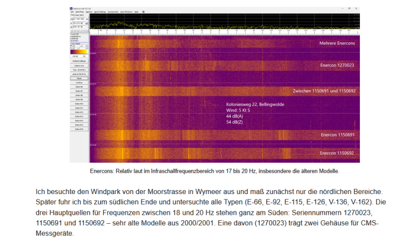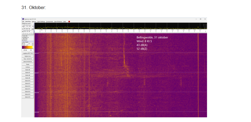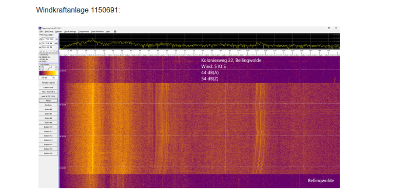 Ik heb Spectrumlab screenshots toegevoegd van vijf slapeloze nachten in Bellingwolde, waarbij ik bij het ontwaken telkens 43 dB(A) heb gemeten. Ook heb ik screenshots toegevoegd van mijn metingen bij de drie oude turbines, en tenslotte heb ik een aantal composiet-afbeeldingen gemaakt om te laten zien dat wat ik in Bellingwolde meet daadwerkelijk matcht met het geluidsspectrum van de drie oude turbines.
