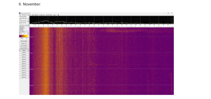 Een andere turbine, eveneens een E-66 uit 2001, draait al acht dagen niet meer. Deze turbine maakte bij mijn meting vorige week een enorm kabaal en gaf een heel vreemd frequentiepatroon te zien in mijn Spectrumlab programma (afbeelding verderop op deze pagina), en hield een half uur later op met draaien. Ook over deze turbine heb ik de eigenaar van het windmolenpark geschreven, maar pas nadat deze al was stilgezet.